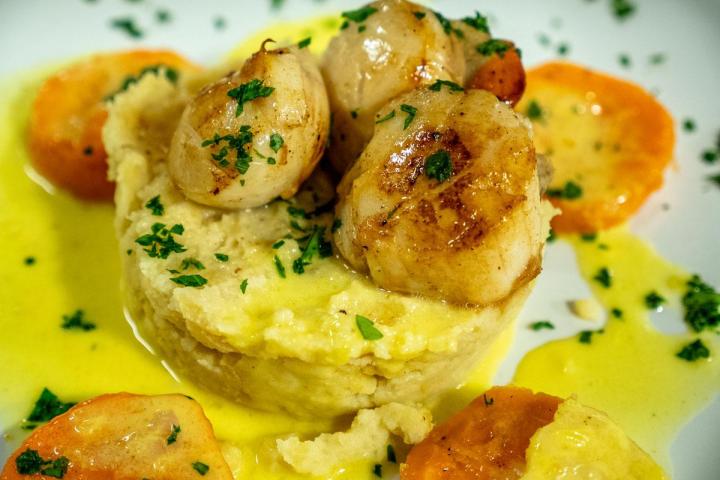 Vous raffolerez des : Ailes de raie sauce safran, écrasé de pommes de terre, Terrine de magret fumé, Cromesquis de pied de cochon, Céleri rémoulade, saumon gravlax, Faux-filet de Salers, Crumble aux pommes, Crème de marrons, Panna cotta aux fruits rouges.